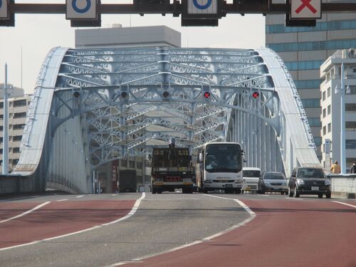 永代橋を渡ろうと。 米朝首脳会談、「合意に至らず」。 橋半ば。臨海の高層ビル群を眺めながら。